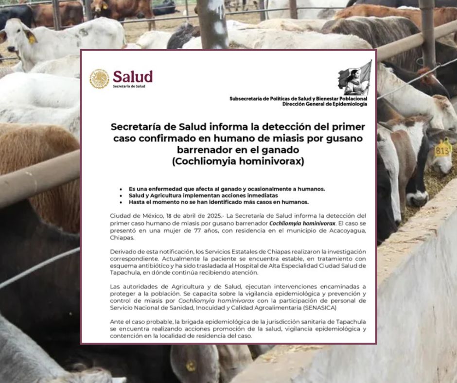 México registró el primer caso humano de miasis por gusano barrenador del ganado. La afectada es una mujer de 77 años, originaria de Chiapas, quien se encuentra estable y bajo tratamiento con antibióticos en el Hospital de Alta Especialidad Ciudad Salud, en Tapachula. La Secretaría de Salud emitió un comunicado oficial para informar sobre este hecho, considerado histórico por ser el primero en humanos en territorio nacional.