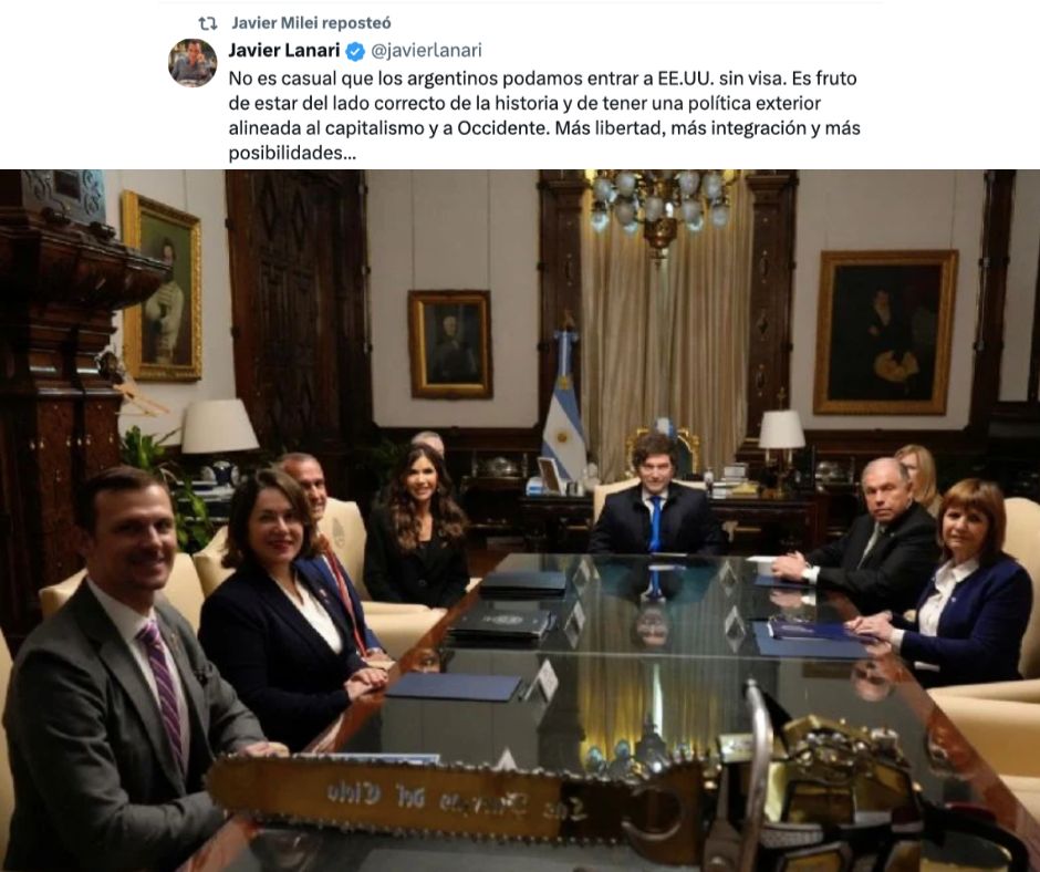 Durante su visita, Noem sostuvo una reunión con el presidente argentino Javier Milei, a quien reconoció como un aliado sólido del gobierno estadounidense. “Bajo el liderazgo del presidente Javier Milei, Argentina se está convirtiendo en un amigo aún más fuerte de los Estados Unidos”, afirmó la funcionaria en un comunicado. Agregó que esta declaración “destaca nuestra sólida alianza con Argentina y nuestro deseo mutuo de promover los viajes legales y, al mismo tiempo, disuadir las amenazas”.