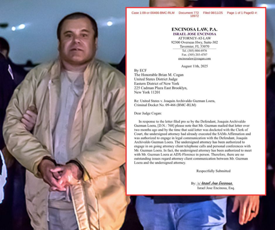 Según Encinosa, desde la emisión de esa carta la situación cambió, y las autoridades federales aprobaron tanto las llamadas como las visitas presenciales. “El abogado que suscribe ha sido autorizado para reunirse en persona con el Sr. Guzmán Loera en el ADX-Florence”, puntualizó en el oficio.