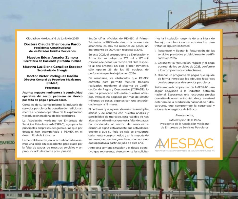 En un comunicado dirigido a la presidenta Claudia Sheinbaum, así como al secretario de Hacienda, Edgar Amador, y a la secretaria de Energía, Luz Elena González, Amespac solicitó acciones urgentes que impidan la interrupción de la actividad energética del país. El documento fue firmado por Rafael Espino de la Peña, presidente del organismo, y describe un panorama en el que gran parte de las empresas afiliadas ya no pueden operar sin recursos garantizados.