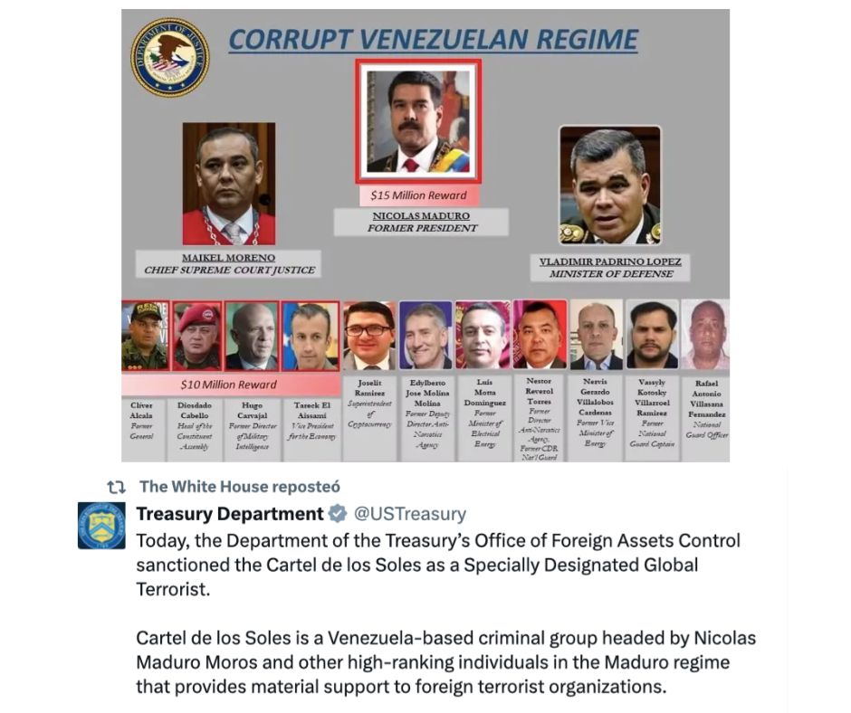Estados Unidos acusa de terrorista al Cartel de Los Soles y a Maduro de ser su líder
