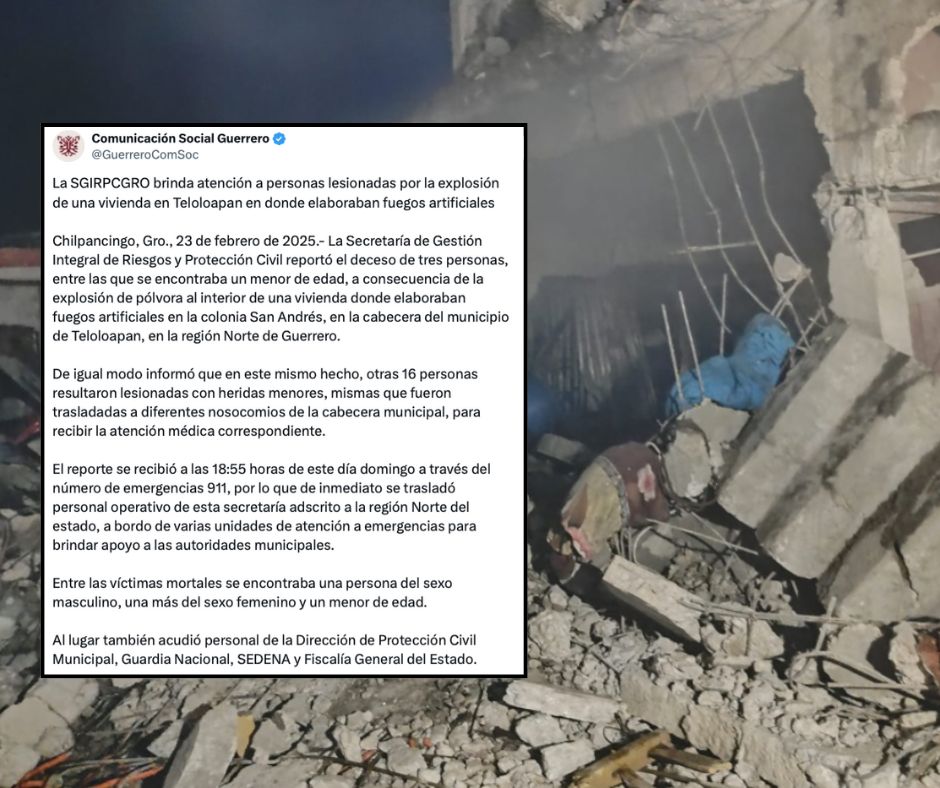 La Secretaría de Gestión Integral de Riesgos y Protección Civil de Guerrero informó que la explosión fue provocada por pólvora almacenada en el inmueble. El primer reporte se registró a las 6:55 de la tarde, momento en el que los equipos de emergencia se trasladaron de inmediato al lugar para auxiliar a las víctimas y evaluar los daños.