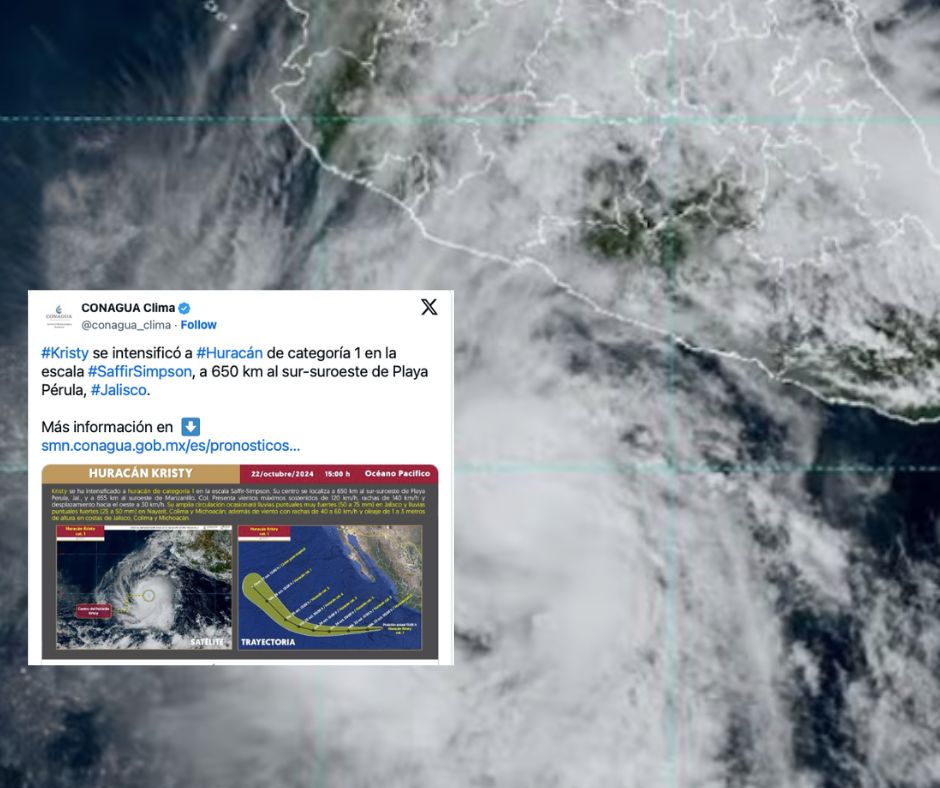 El huracán Kristy ha captado la atención de meteorólogos y autoridades tras su rápida evolución. Este martes, la Comisión Nacional del Agua (Conagua) confirmó que Kristy, que inicialmente era una tormenta tropical, ha alcanzado la categoría 1 en la escala Saffir-Simpson, y se espera que continúe fortaleciéndose en las próximas horas. De acuerdo con el último informe de las 15:00 horas, el centro del huracán se encuentra a 650 kilómetros al sur-suroeste de Playa Perula, Jalisco, y a 655 kilómetros al suroeste de Manzanillo, Colima.