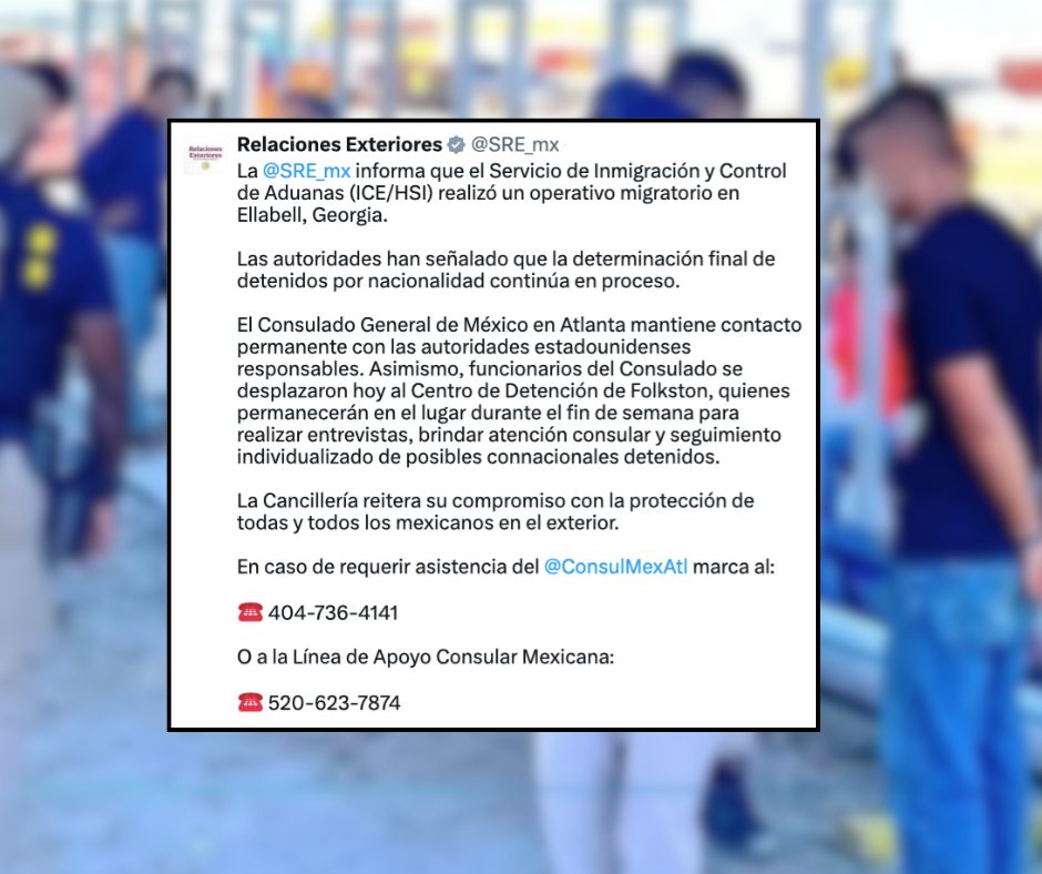 El Consulado General de México en Atlanta mantiene comunicación directa con las agencias migratorias responsables del operativo para conocer la situación de los posibles connacionales involucrados. Como parte de la atención, funcionarios consulares se trasladaron al Centro de Detención de Folkston, donde permanecerán durante el fin de semana con el objetivo de entrevistar y asistir a ciudadanos mexicanos que pudieran haber sido arrestados.