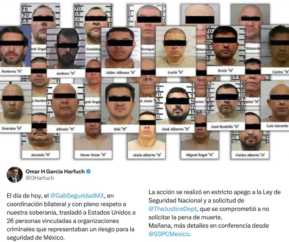 Este martes 12 de agosto, el Gobierno de México concretó la extradición de 26 personas requeridas por Estados Unidos por su presunta relación con organizaciones criminales dedicadas al tráfico de drogas. Los implicados, recluidos en distintos centros penitenciarios del país, fueron entregados bajo protocolos que garantizaron sus derechos y con el compromiso del Departamento de Justicia estadounidense de no solicitar la pena de muerte en ninguno de los casos.