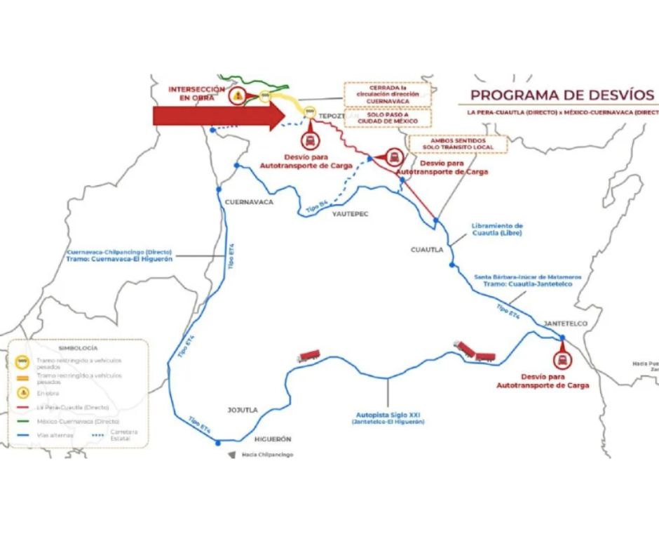 El cierre afectará la circulación en el sentido Cuautla-Cuernavaca, desde el tramo Plaza de Cobro «Tepoztlán» en el kilómetro 7+500 hasta el kilómetro 0+000, precisamente en el entronque «A Cuautla». Los automovilistas que transiten en dirección a Cuernavaca desde Cuautla deberán buscar rutas alternas, ya que el acceso estará completamente restringido durante los trabajos.