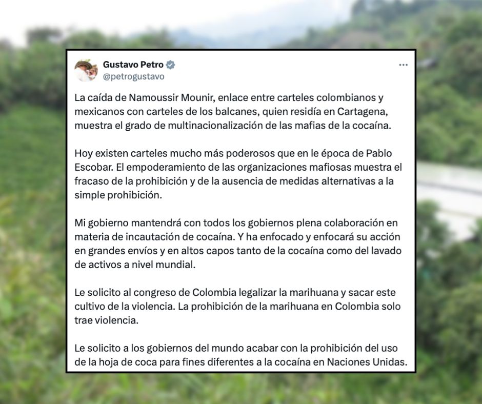 El consumo de cannabis con fines medicinales es legal en Colombia desde 2016, pero los intentos por regularizar su uso recreativo han fracasado en el Congreso. La petición de Petro se dio en el contexto de la captura de Namoussi Mounir, alias «Mou», un presunto enlace entre el cártel de los Balcanes y narcotraficantes de Latinoamérica, incluido el Clan del Golfo, la organización criminal más grande del país.