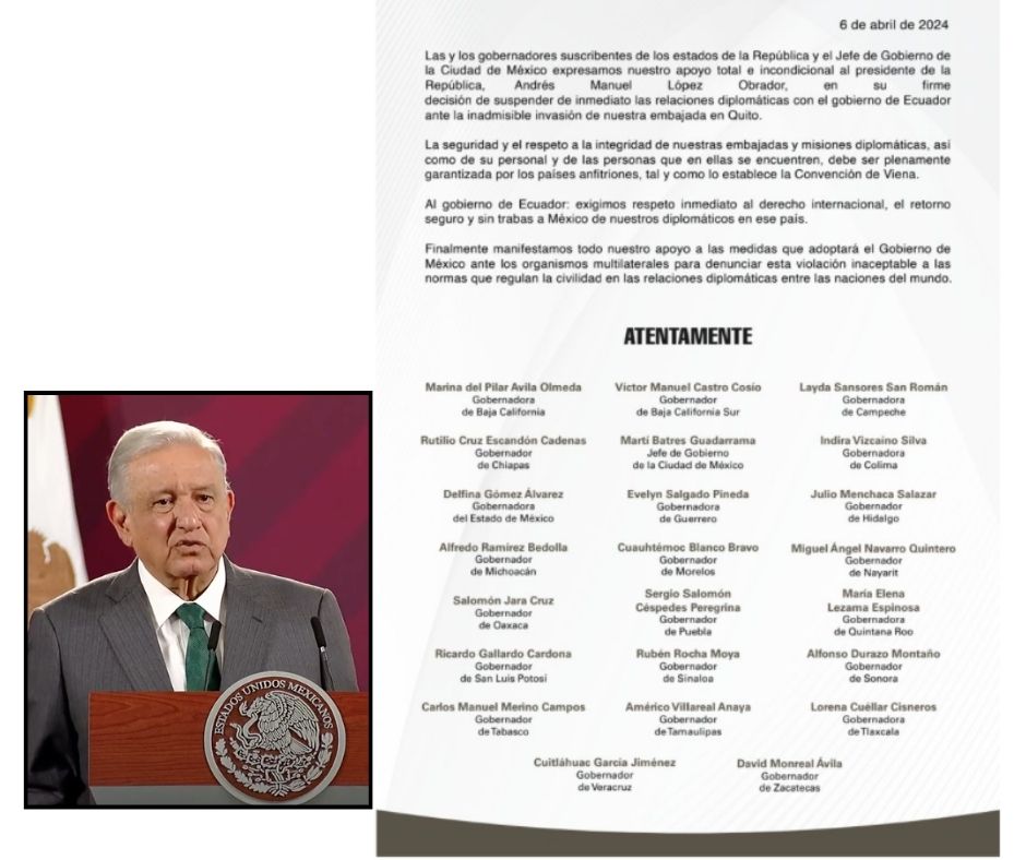 Además, 22 gobernadores de estados mexicanos respaldaron la decisión de López Obrador de romper relaciones diplomáticas con Ecuador y exigieron el retorno seguro de los diplomáticos mexicanos en el país sudamericano. Firmaron un documento expresando su apoyo total al presidente y anunciando su respaldo a las medidas que adoptará México ante organismos multilaterales.