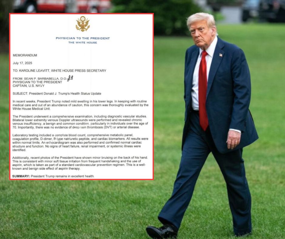 Karoline Leavitt, secretaria de prensa presidencial, leyó la nota oficial del médico, donde se detalla que Trump, de 79 años, se sometió a estudios vasculares especializados que incluyeron ultrasonidos Doppler venosos bilaterales en las extremidades inferiores. Los resultados arrojaron que padece insuficiencia venosa crónica, una condición común entre adultos mayores, especialmente en quienes superan los 70 años.