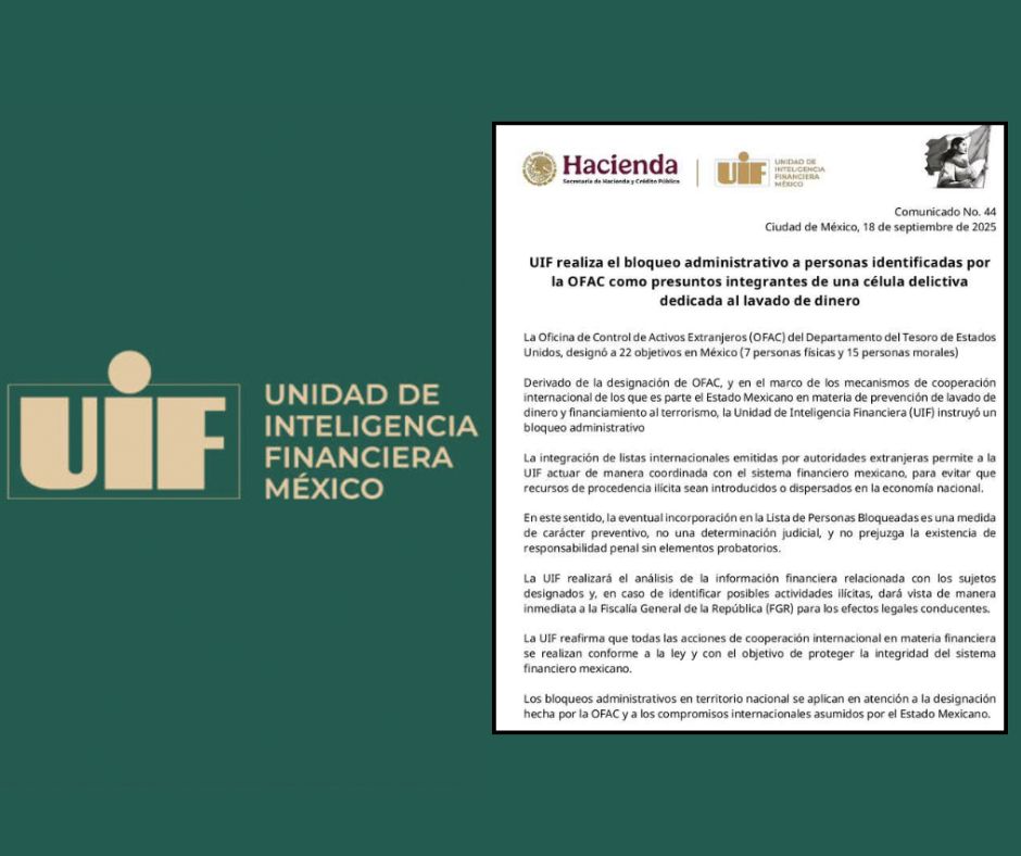 Con este bloqueo, la UIF mantiene el enlace directo con las disposiciones de la OFAC, refrendando la colaboración bilateral entre México y Estados Unidos en la lucha contra el lavado de dinero y el financiamiento de estructuras criminales.