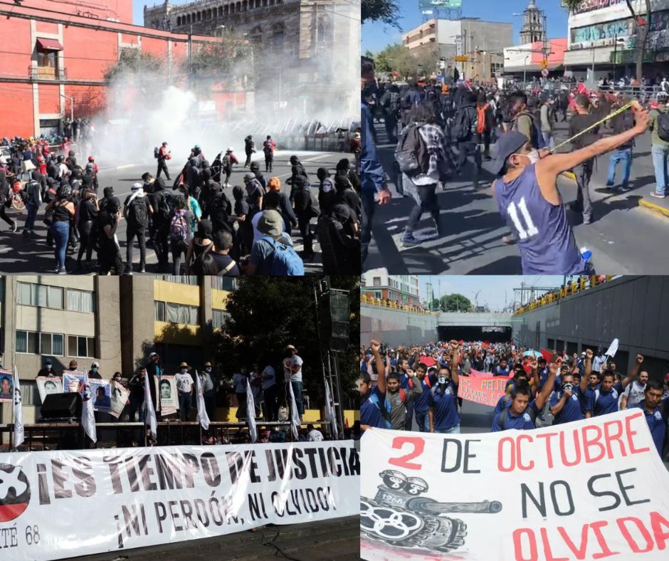 La conmemoración por el 57 aniversario de la masacre de Tlatelolco, ocurrida el 2 de octubre de 1968, se transformó en un escenario de tensiones, destrozos y enfrentamientos en la Ciudad de México. La marcha inició a las 16:00 horas en la Plaza de las Tres Culturas, en el Conjunto Tlatelolco, y avanzó con destino al Zócalo capitalino. En ella participaron estudiantes de la Universidad Nacional Autónoma de México (UNAM), del Instituto Politécnico Nacional (IPN), preparatorias, así como organizaciones campesinas y civiles.